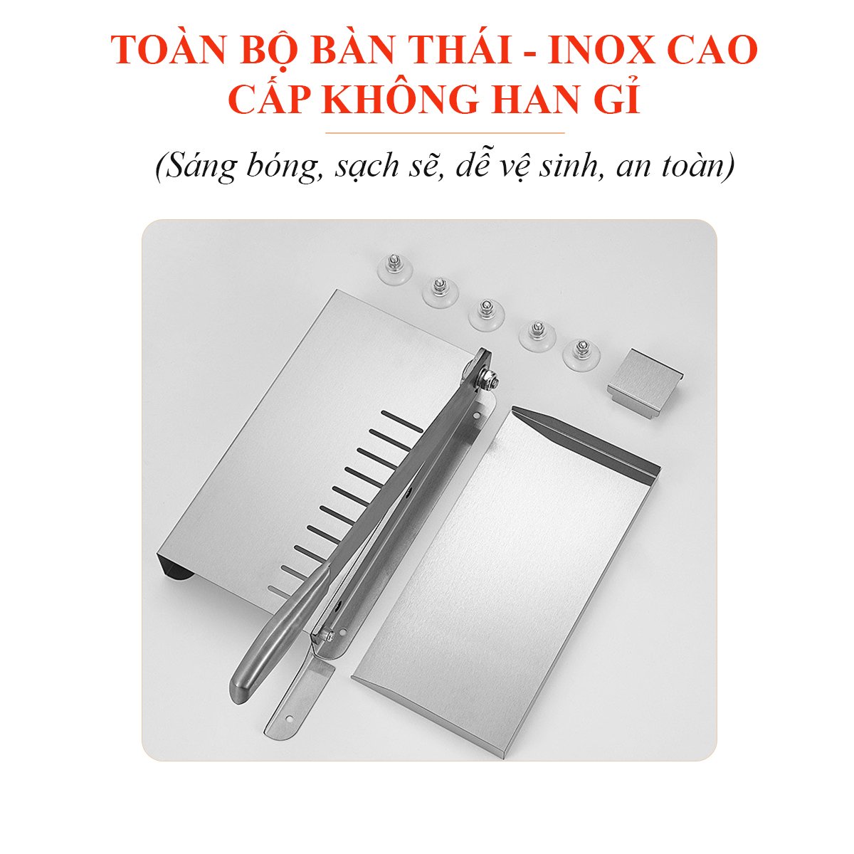 Toàn bộ bàn thái và các chi tiết được làm từ inox không gỉ, an toàn, dễ dàng vệ sinh, sáng bóng, bền đẹp