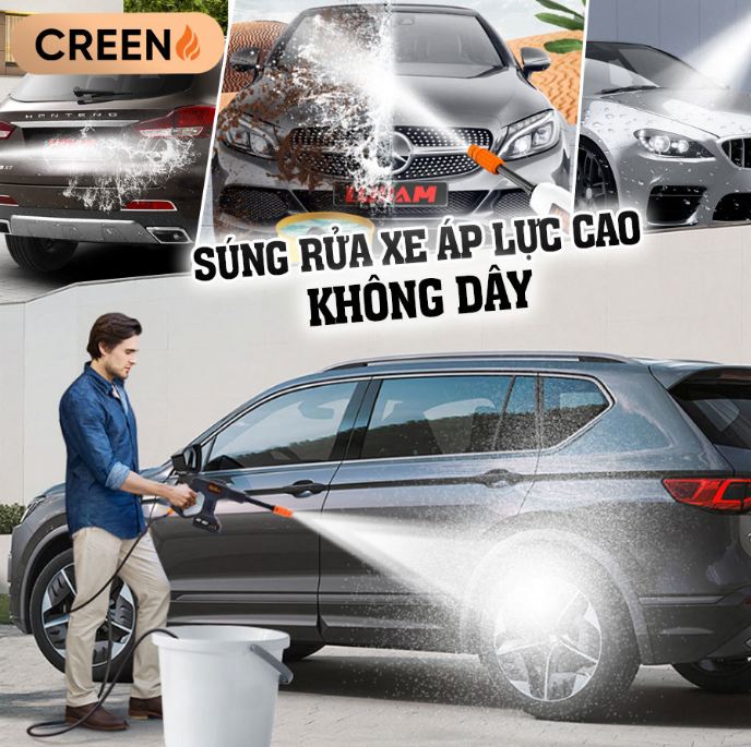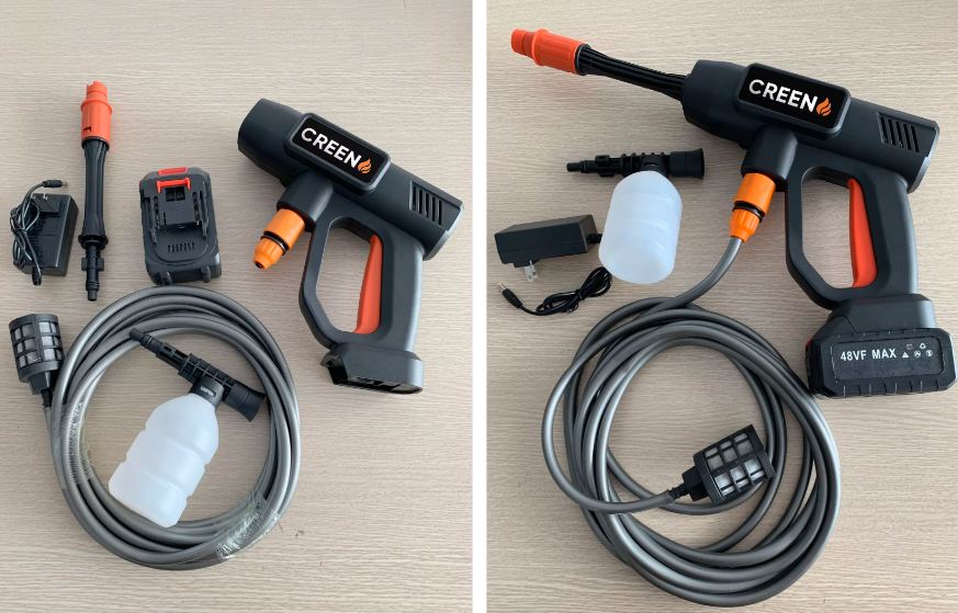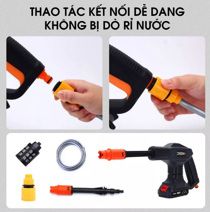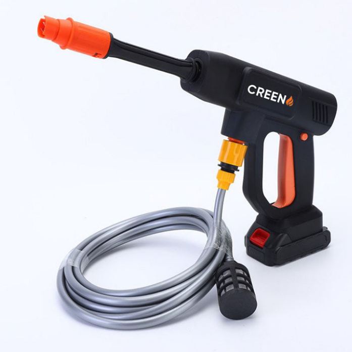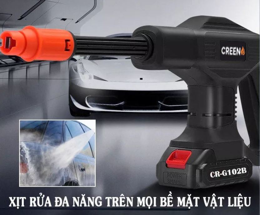 Súng rửa xe Creen G102, 24V với thiệt kế chắc chắn vừa tay cầm giúp dể dàng sử dụng.Vòi xịt có thể đều chỉnh nên có có thể dùng dùng cho máy bơm nước mini để rửa xe, máy lạnh, tưới cây……