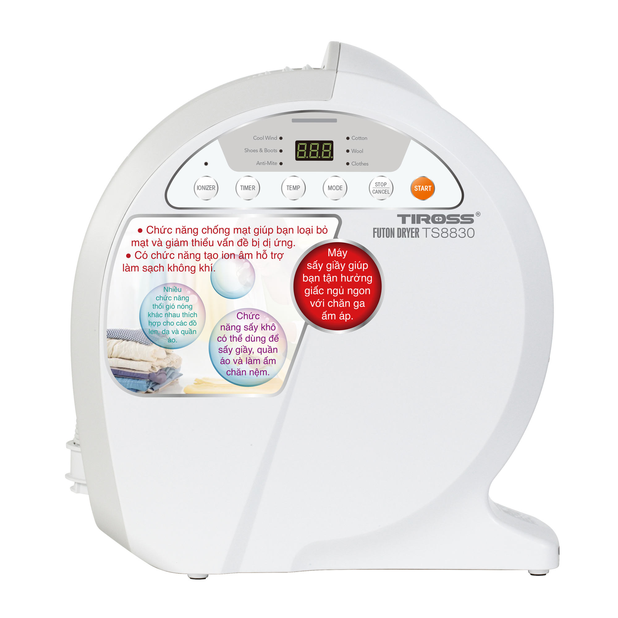 Máy sấy và khử mùi giày Tiross TS8830 sấy khô nhanh chỉ trong thời gian ngắn với 2 dầu sấy cho giày và ủng hỗ trợ khử mùi hôi giày. Máy có chứ năng sấy khô có thể dùng sấy giày, quần áo và làm ấm chăn đệm tạo cảm giác ngủ ngon cho mùa đông. Máy có chức năng chống mạt, hỗ trợ loại bỏ mạt và tránh dị ứng. Máy sấy và khử mùi giày này thiết kế kích thước nhỏ gọn, có tay cầm chắc chắn dễ dàng xách di chuyển mọi nơi, thao tác sử dụng đơn giản, dễ sử dụng với bảng điều khiển kỹ thuật số cùng màn hình LED hiển thị rõ nét. Máy thiết kế ống sấy có thể kéo ra và thu gọn lại tùy ý, tiện dụng.