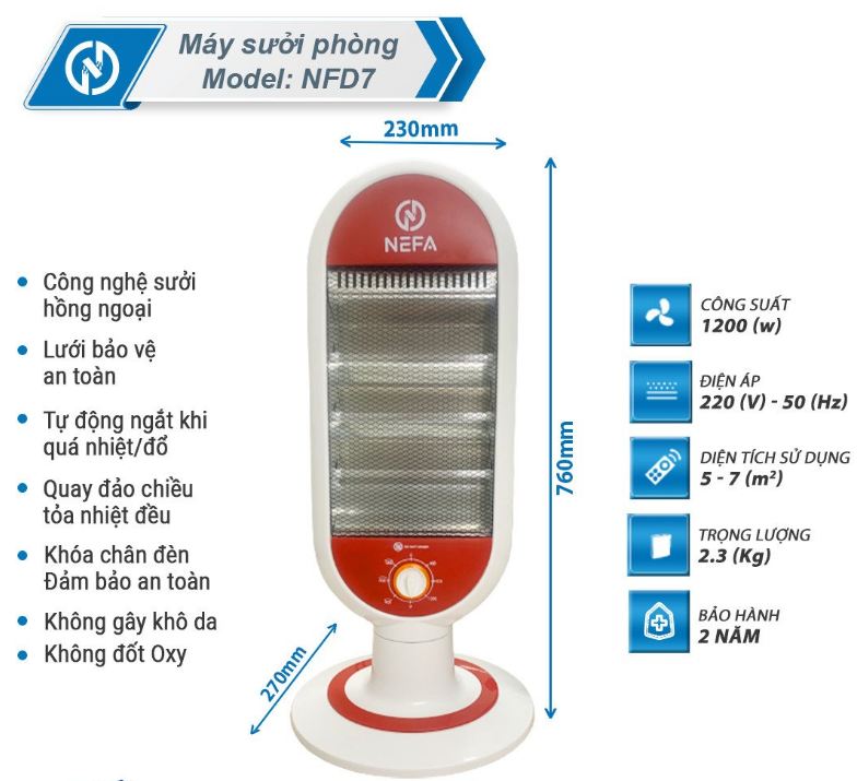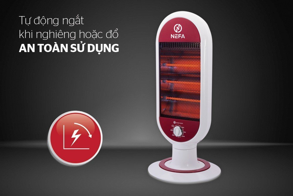 Quay đảo chiều, tỏa nhiệt đều khắp phòng Sản phẩm có khả năng quay đảo chiều liên tục, giúp tỏa nhiệt đều khắp phòng, rất thích hợp khi sử dụng tại không gian rộng như phòng khách hoặc phòng có nhiều người. An toàn với người sử dụng Sưởi điện hồng ngoại NEFA NFD7 có chế độ tự động ngắt điện khi bị nghiêng đổ và hoạt động trở lại bình thường trở lại trạng thái an toàn.