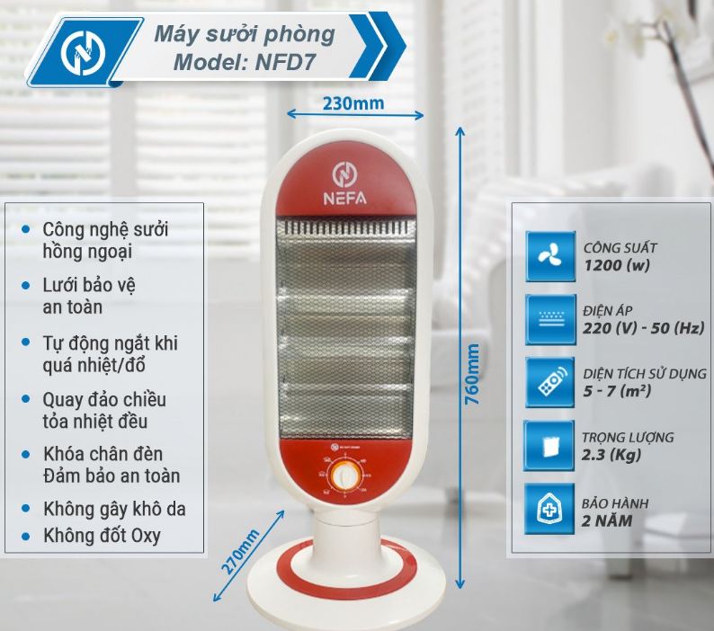 – Máy sưởi NEFA NFD7 là một trong những thiết bị sưởi ấm không thể thiếu tại gia đình trong mùa đông. Sản phẩm sử dụng đèn hồng ngoại siêu bền, tỏa nhiệt đều, không gây khó thở và khô da, đảm bảo an toàn cho người sử dụng.