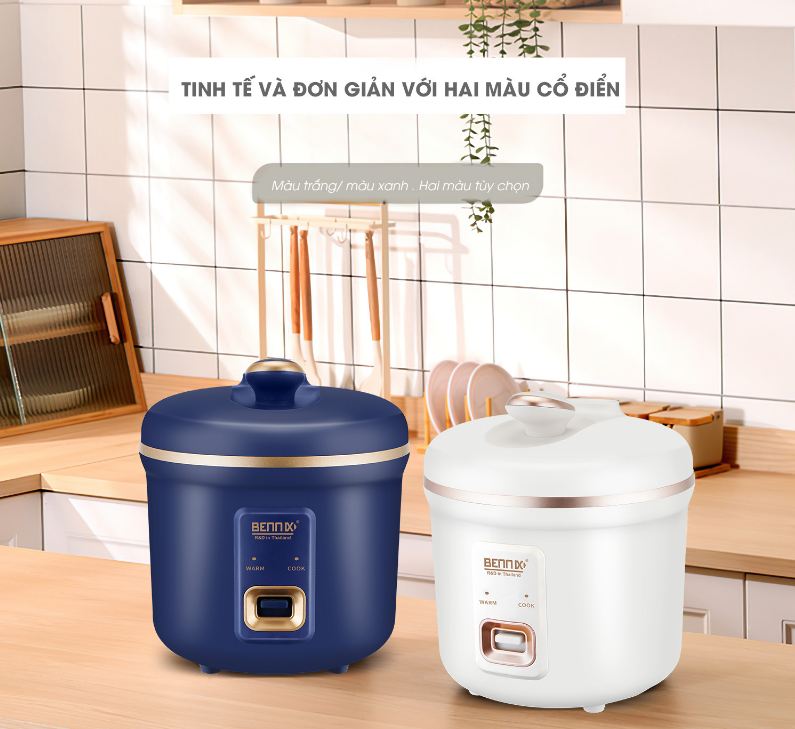 Nồi cơm điện mini 1 lít Bennix có 2 màu trắng kem và xanh coban sang chảnh, sở hữu kiểu dáng gọn nhẹ, màu sắc tinh tế. Còn gì bằng khi vừa là nồi nấu cơm lại thêm vai trò là vật deco trong không gian bếp?