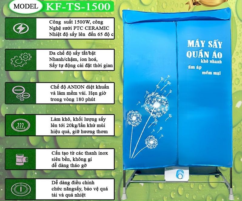 Công suất máy 1500Ư ,So với thị trường máy được trang bị những công nghệ sưởi PTC Ceramic nổi bật giúp cho quần áo chúng ta có thể khô nhanh và diệt khuẩn lên đến 99% .Nhiệt độ sấy lên đến 65 độ c.